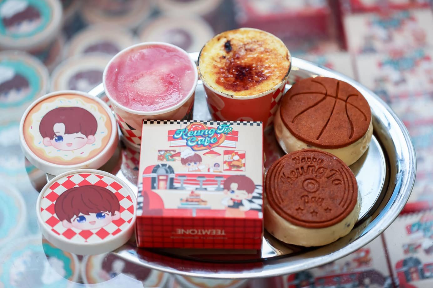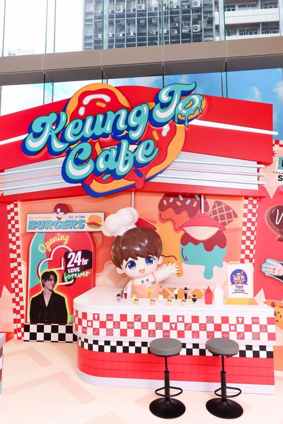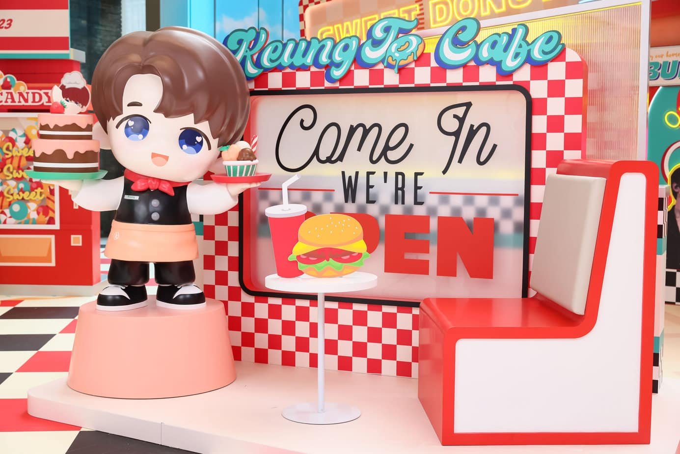 「Keung To 430 甜蜜蜜Café」位處尖沙咀The ONE,紅色的設計主色給人一種活力及熱情的感覺,格子令人聯想美國公路電影中,充滿時代氣息的Café,讓大家憶起姜濤去年到美國出差的快樂回憶 。各種美食的裝飾設計,也是姜糖們為最愛漢堡包的姜濤而構思出的夢幻場景。姜糖們的目標當然是7大打卡場景,當中少不了立體小濤濤及小姜姜,而且有超多姜濤人像的打卡位。而今次也是姜濤香港後援會首次製作及售賣23+1限定版生日甜品,成品精緻可愛,姜糖們由心而發的甜,一定比甜品甜度更高更濃厚!