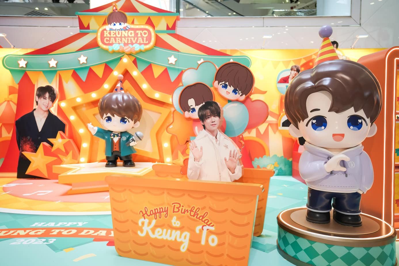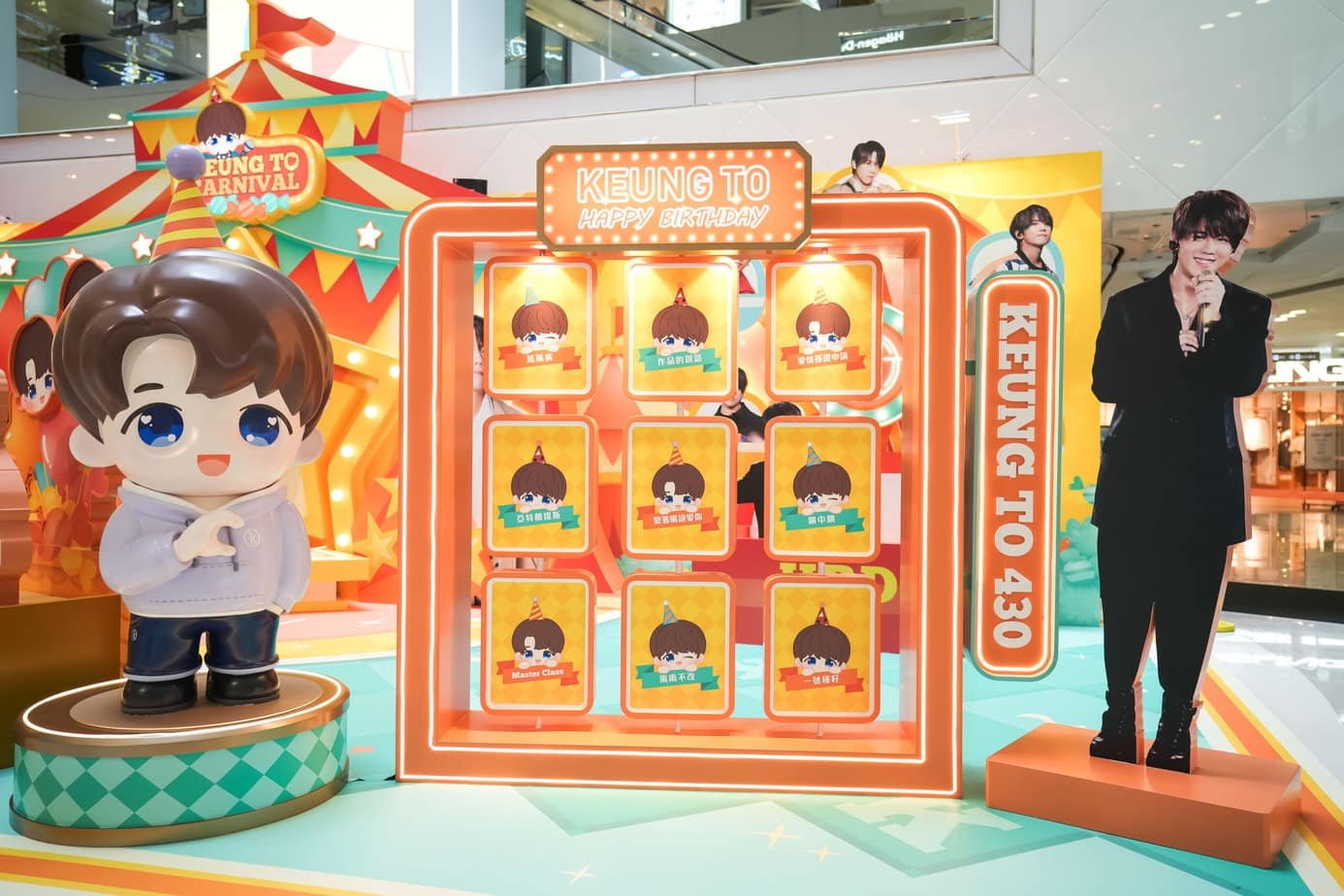 而在銅鑼灣皇室堡的「Keung To 430 生日嘉年華」,用上姜濤的標誌顏色—桃橙色作主調,傳遞溫暖的感覺,而嘉年華主題令場地洋溢着歡樂和熱鬧的氣氛,6大打卡場景包括跟姜糖們連結的舞台、沖上雲霄的氣球籃、浪漫的摩天輪、爆谷小食車、翻卡牌遊戲及姜濤430生日限定店,都給多個姜濤造型以及立體的小姜姜及小濤濤所包圍。姜糖們不可錯失的Keung To 430生日限定店,除了打卡外,更有注目度極高的必買品,包括小濤濤頸枕連cushion、小濤濤無線充電器、姜糖化妝袋等,收益扣除成本後,撥歸指定慈善機構,跟隨姜濤一樣,在社會散播善良及愛心。