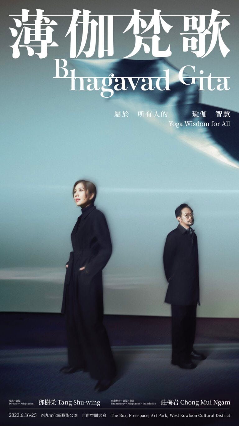 《薄伽梵歌》始於戰士阿周那面對的兩難:殺害同族與維護正義,該如何抉擇?如何選擇才能符合自己於世上的角色和位置,完成「天職」?鄧樹榮導演近年一直想把這部經典帶給香港觀眾,因為當中揭示的瑜伽之道具有很強的現實意義,他形容其為迄今最個人化,亦最宇宙性的作品,讓觀眾從生與死的角度切入,思考自身與世界的聯繫。作品將呈現一個超現實的舞台時空,除了黃智雯和朱栢謙演繹對話,一眾高能量表演者將糅合各種藝術形式如舞蹈、形體、瑜伽、視覺藝術等元素,把舞台轉化成冥想的空間,溶化劇場界限。