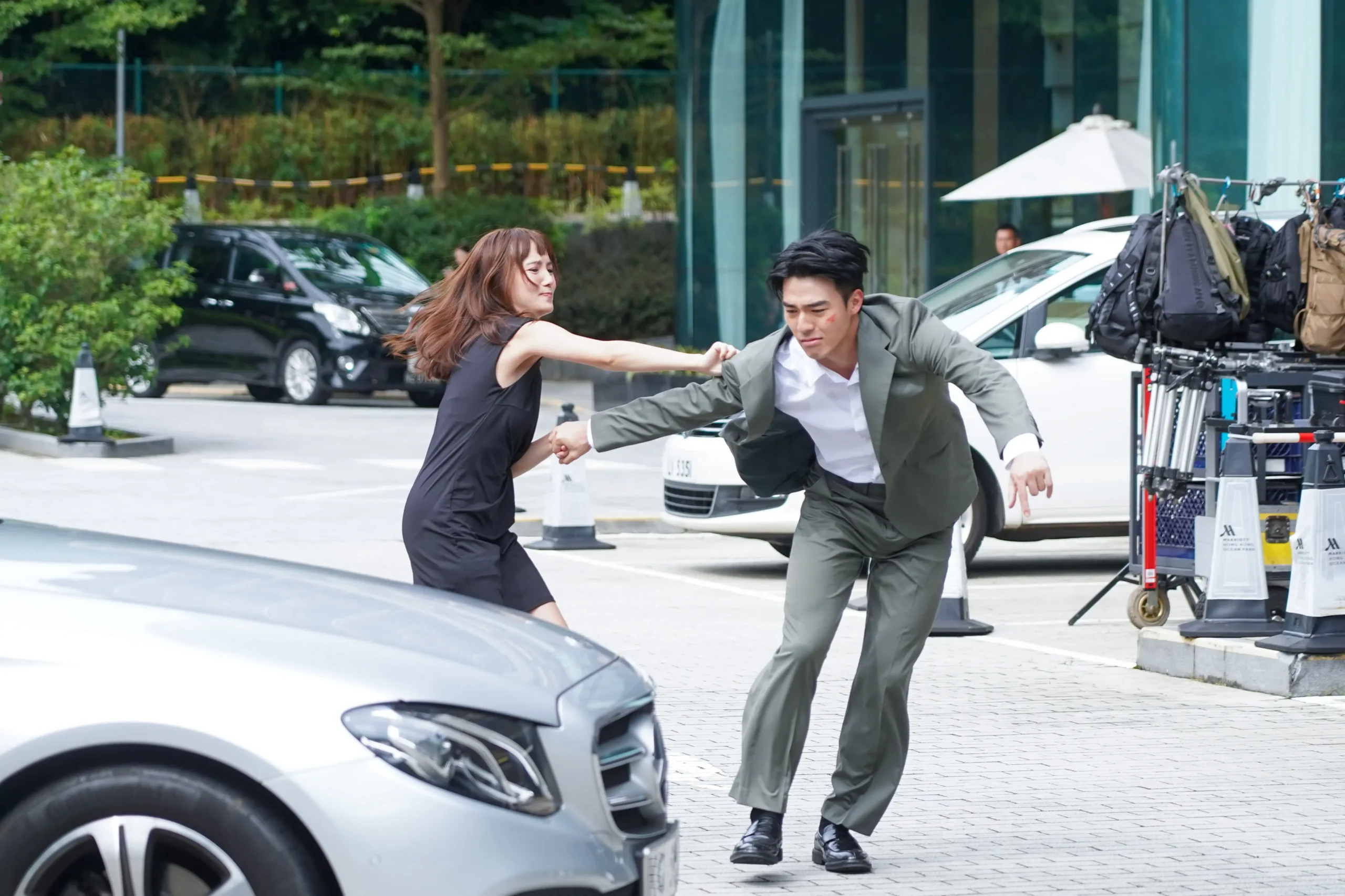 從酒店大堂拉扯到露天停車場,Anjaylia不斷掙扎反抗,鏡頭前她只打了陳昊森一巴掌,但其實捉捉摑了六巴掌,打到Anjaylia手痛心更痛,她說:「拍呢場戲我好緊張,因為唔只有動作場面,當中亦有好多情緒,心裏有少少壓力,好驚打落去唔啱位,浪費情緒亦浪費咗對方嘅臉皮。」身旁的陳昊森臉上的紅印還未消散,反過來安慰她說:「唔會,唔會!」Anjaylia為免誤傷陳昊森,她特意去修甲,又打自己做測試,她說:「我去修甲,磨滑指甲邊沿,自己試咗好多次肯定唔會掌摑時整傷佢,好彩無事,依然咁靚仔,很帥!」她用右不停摑打自己的左手臂做測試,陳昊森見狀一臉感動。