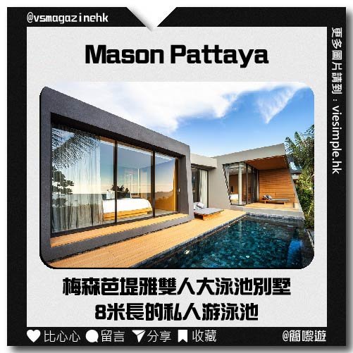 Mason Pattaya 位於芭堤雅更寧靜的地方,也靠近曼谷,交通便利,提供自然美景中的私人度假勝地。雙人大泳池別墅是一棟兩臥室單層豪華別墅,裝飾時尚,最多可容納四人入住。專為展示整個別墅的壯麗海景而設計,沿著8米長的私人游泳池和按摩浴缸,在蔚藍大海的全景背景下享受最令人難忘的瞬間。在寬敞的日光浴平台露台上的時尚躺椅上放鬆身心。大臥室配有帶超大浴缸和步入式衣櫥的套間浴室。可直接從浴室進入私人泳池,享受更多私人空間。別墅距離酒店的私人海灘入口僅有短短的五分鐘步行路程。