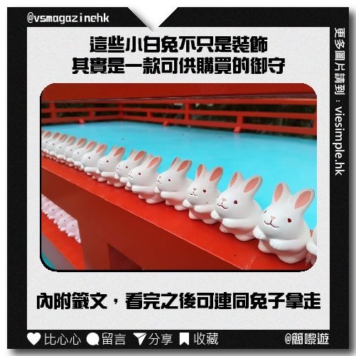 顧名思義,『兔子神社』當然不少得兔子元素。神社的鳥居和本殿兩旁都擺滿了小白兔裝飾,不過這些小白兔不只是裝飾,其實是一款可供購買的御守,內附籤文,看完之後可連同兔子拿走。這款御守主要祈求家庭平安,兔年大家去日本不妨到這裡朝聖一下。