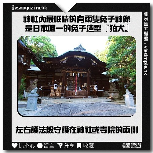 神社內最吸睛的有兩隻兔子神像,一隻是兔子造型的『狛犬』,『狛犬』被稱為神使,是獅子與狗的混合體,左右護法般守護在神社或寺院的兩側,岡崎神社本殿前方這對是日本唯一的兔子造型『狛犬』,超級可愛,打卡必到!