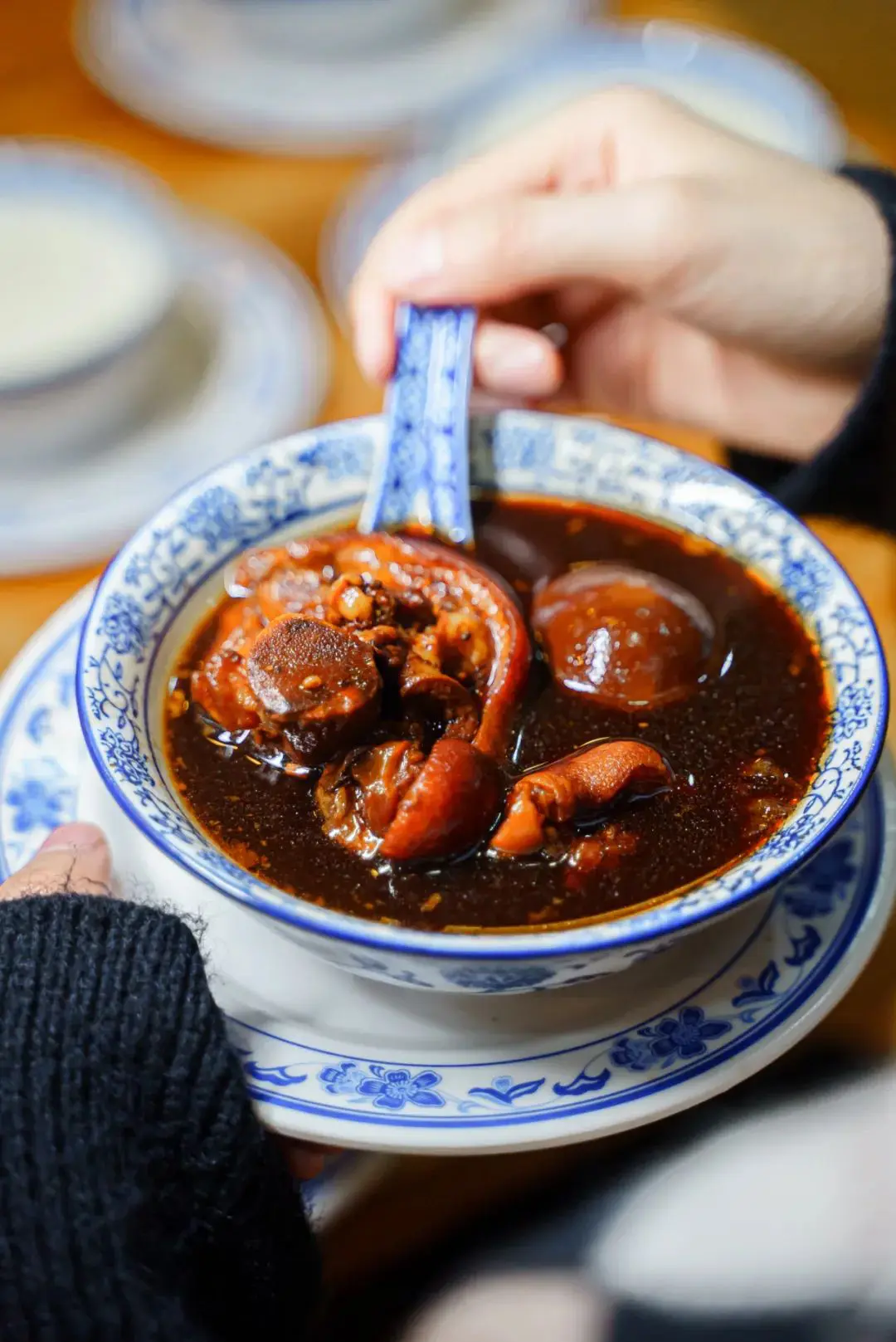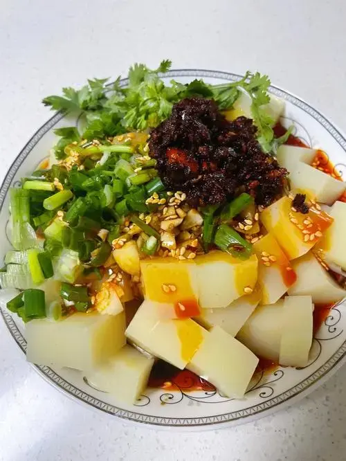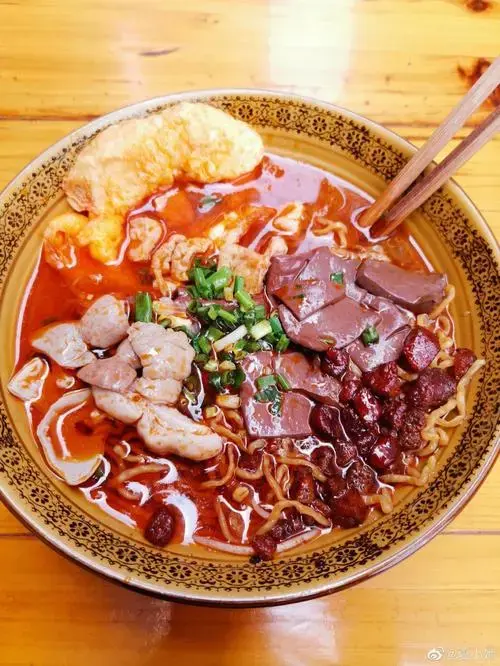 烙鍋是把各種食材放到鍋上烙煎,中途翻面,熟了就用鏟刀切成小塊再蘸佐料食用,幾個人圍著吃還挺有風味的。還要點他們的涼拌米豆腐和腸旺麵,米豆腐口感像涼粉,又帶著米味,非常特別;招牌腸旺麵用豬大腸、豬血、豬油渣為輔料煮製,血嫩、麵脆、辣香、湯鮮,正宗老貴陽味道。