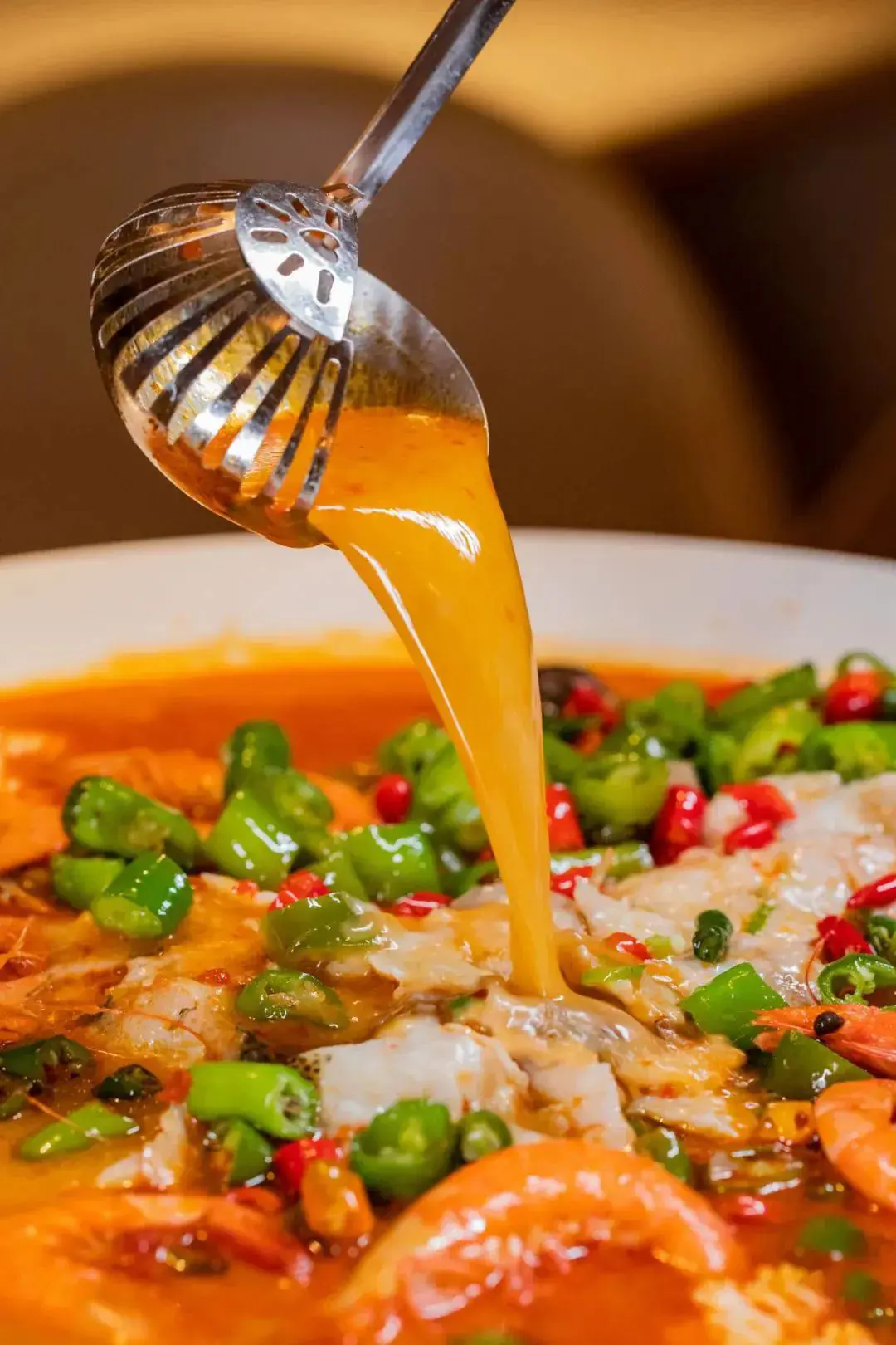 嫌水煮魚太辣?不妨試試這道鮮椒海鮮豆花鱸魚,配料有超大隻基圍蝦,用鯽魚熬製的湯底鮮味可口,用來泡飯吃一流!