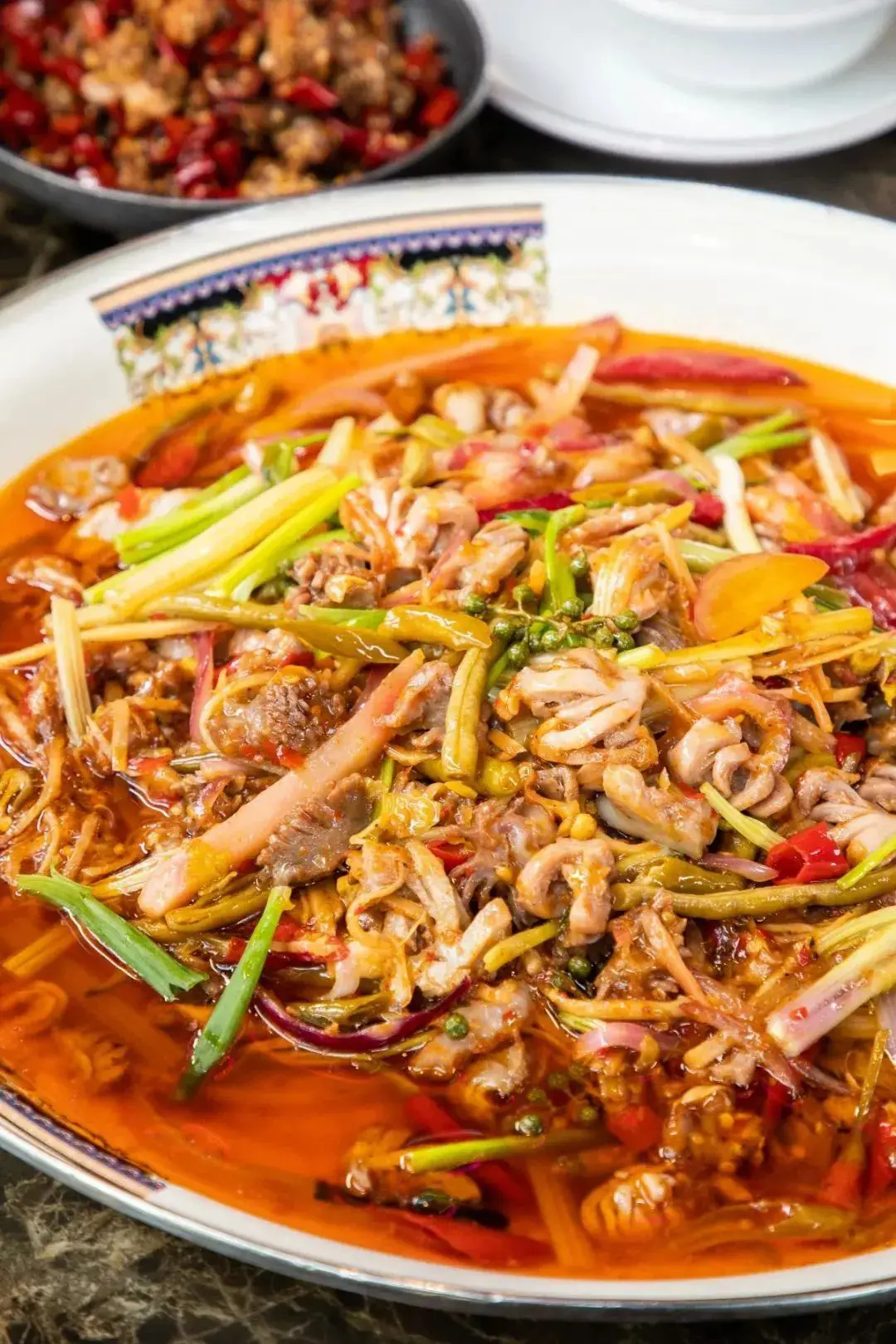 泡椒雙脆也是江湖大菜,主菜是生腸和雞胗,配料有泡椒、泡薑和酸羅蔔,酸辣爽口,特別開胃!