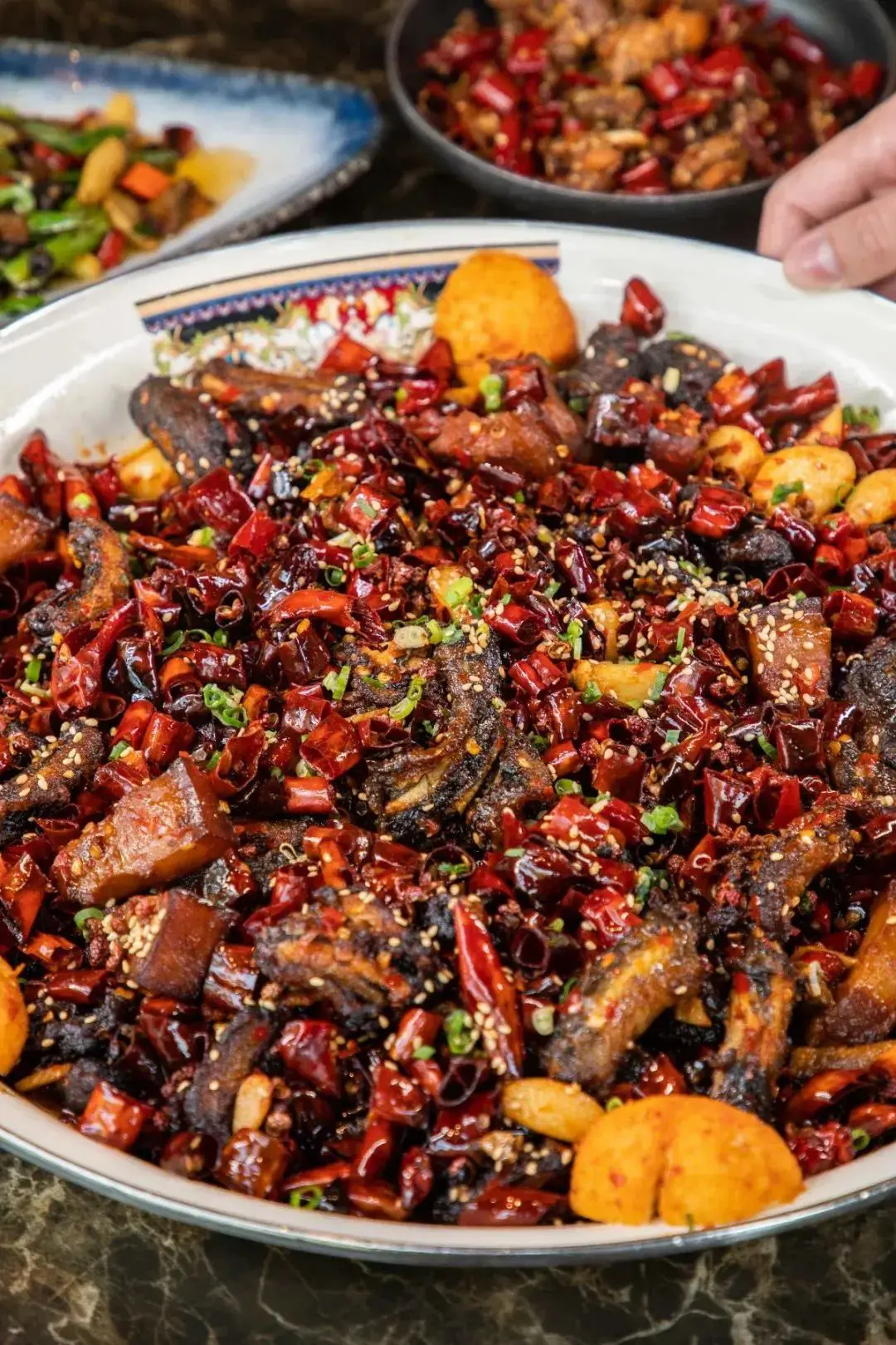 這道山椒水庫魚頭,魚頭有4斤重,上桌足以震懾全場。即叫即宰的鱘魚配上衡陽的剁山椒,原汁清蒸25分鐘。如何正確享用魚頭呢?先澆汁,然後要挑腮邊肉來吃,精華醬汁留著拌麵。