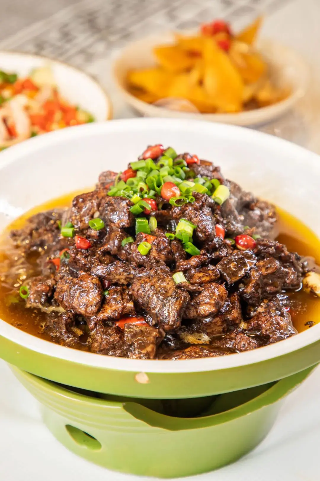 來自湖南永州的特色名菜『永州血鴨』,鴨肉緊實微辣鹹香,裹上鴨血爆炒,送飯一流。