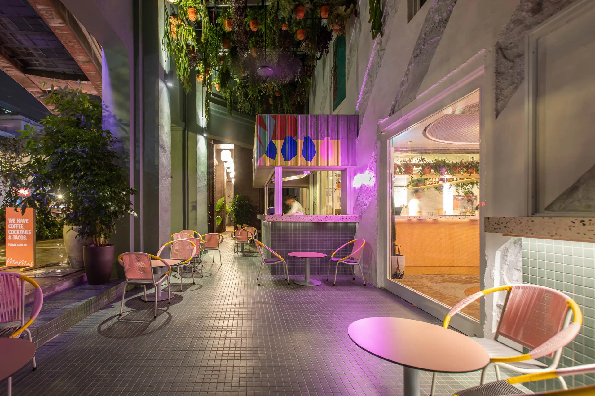 Momo’s的外觀以灰調綠色的外牆與粉紅色的桌椅作配搭,加上周圍的綠色植物,獨特的設計讓人忍不住停下來打卡!進入旅店底層的接待和用餐處,以木質元素和珊瑚色為主,以樹葉乾花等為裝飾,給人一種森系的感覺。旅店整體呈現了工業風與時尚感結合的風格,除了戶外的座位之外,旅店的接待處旁邊還有一個名為MoMosita的自助式吧台,為旅客提供小食和啤酒,設計也非常新穎,牆上的霓虹燈、鮮艷的配色,走廊上有藝術家設計的壁畫彩繪,還有一些多用途木箱,非常適合拍照打卡!