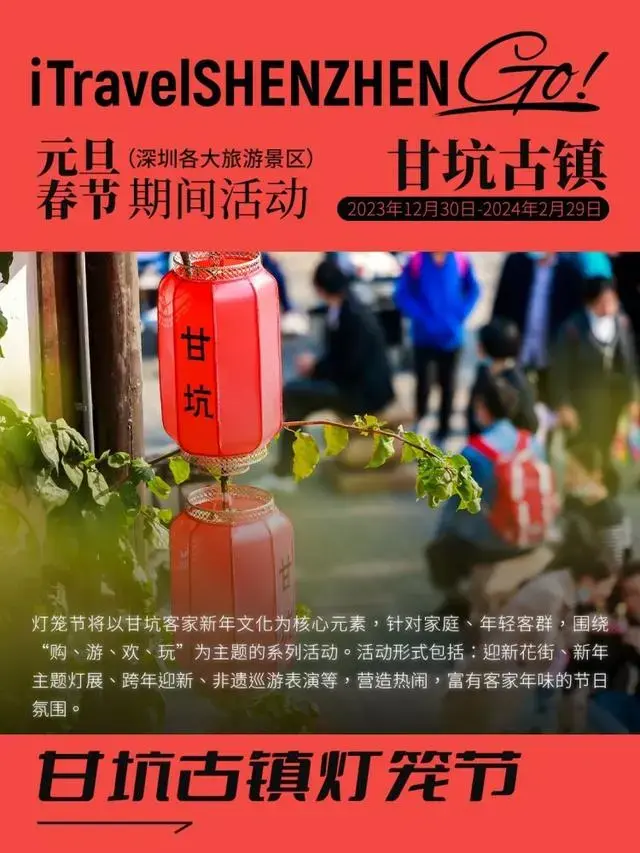 甘坑古鎮燈籠節將以甘坑客家新年文化為核心元素,針對家庭、年輕客群,圍繞「購、遊、歡、玩」為主題的系列活動。活動形式包括:迎新花街、新年主題燈展、跨年迎新、非遺巡遊表演等,營造熱鬧,富有客家年味的節慶氛圍。