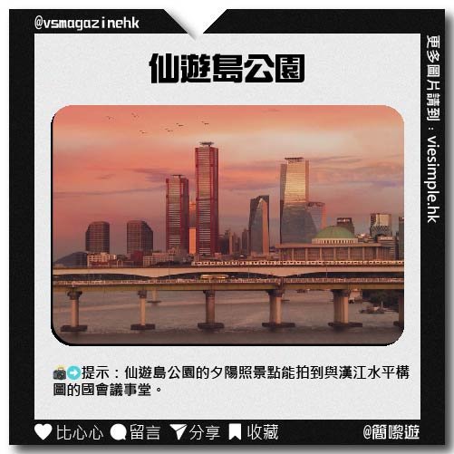 仙遊島公園深受喜歡在各處拍攝生活照的人們以及享受約會的情侶們的喜愛。如果您從橋上眺望國會大廈拍照,您可以捕捉到美麗如畫的日落。