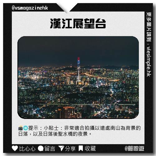 白天在首爾林散步和野餐,日落時,步行前往水博物館,登上漢江展望台。有一家鮮為人知的首爾日落餐廳,非常適合拍攝以遠處南山為背景的日落,以及日落後聖水橋的夜景。