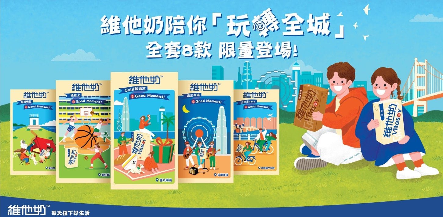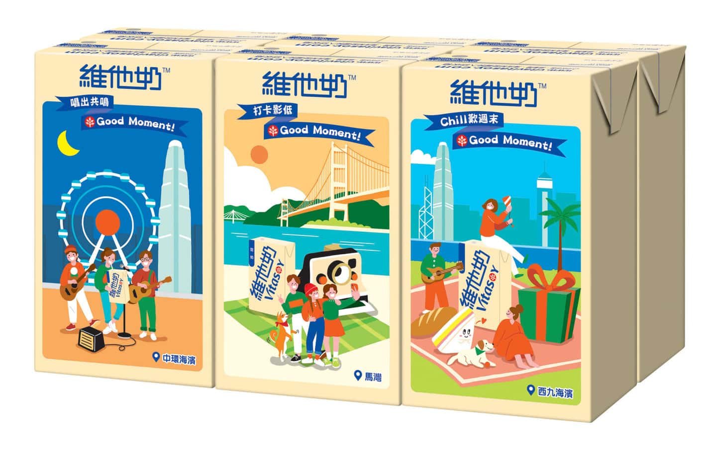 維他奶TM包裝上的插畫設計遍及港九新界及離島,陪你去到邊玩到邊,玩盡每個Good Moment!8個熱點各有特色,喜歡接觸大自然的可以去太平山頂行山,蒲台島露營;放鬆身心的可以去西九海濱野餐,中環摩天輪看街頭表演或馬灣欣賞日落;輕鬆放電就可以去沙田城門河畔踩單車,彩虹邨打籃球以及炮台山公園踩滑板。維他奶TM陪住大家約實親朋好友一齊出外走走,拉近彼此距離!