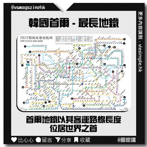 首爾地鐵則以其客運路線長度位居世界之首。實際的數據是紐約市的地鐵系統運行長度最長,但紐約地鐵的許多線路並沒有乘客使用,這就使得首爾的地鐵成為了客運線路最長的地鐵。