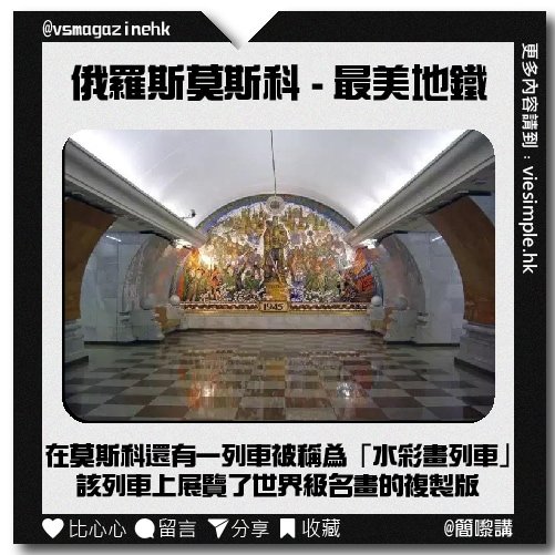 莫斯科地鐵站是世界公認的最美麗的地下車站;另外,在莫斯科還有一列車被稱為「水彩畫列車」,該列車上展覽了世界級名畫的複製版,以供乘客觀賞。