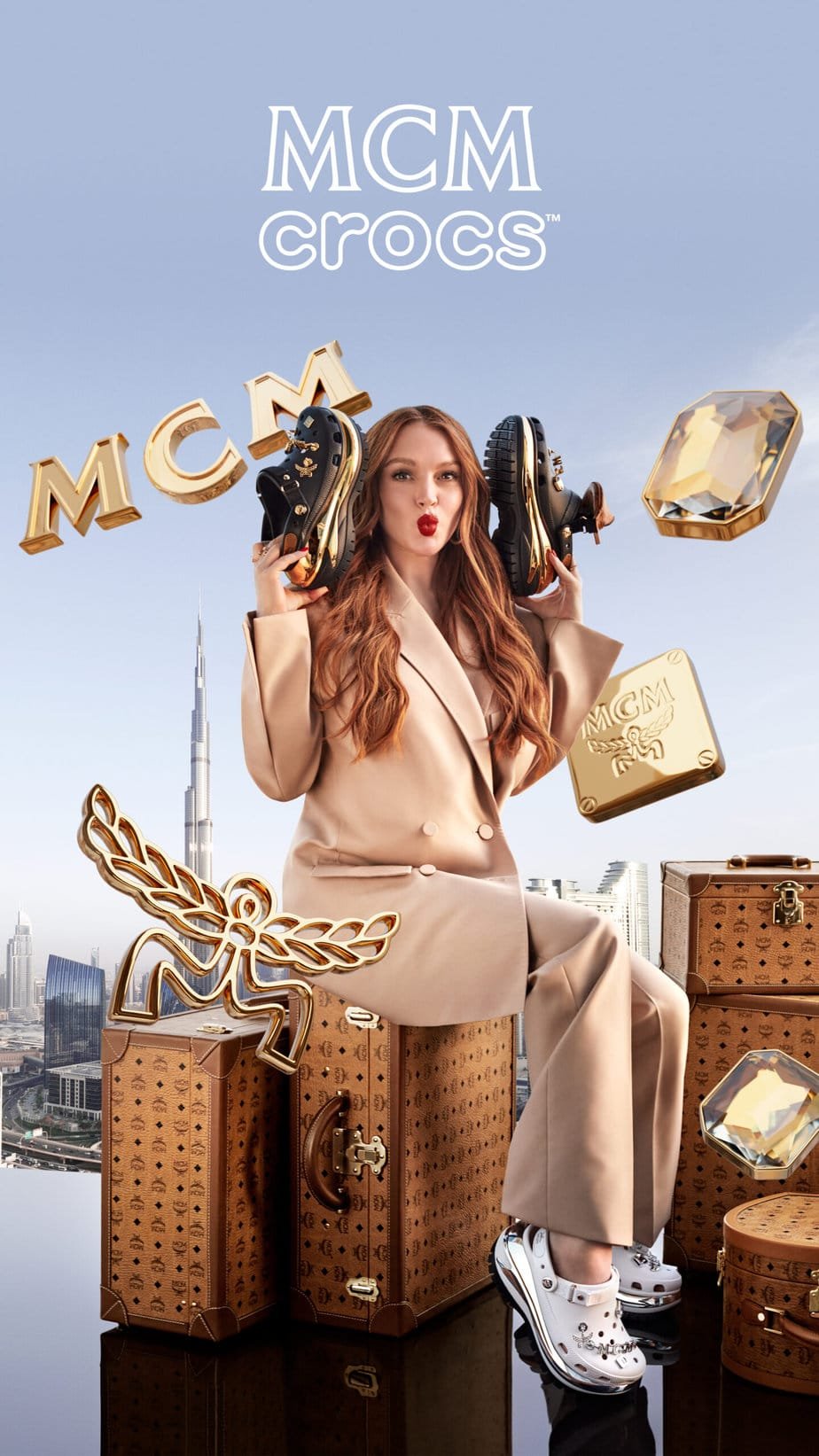 Lindsay Lohan說「當MCM邀請我參與他們與Crocs 最新聯乘合作時,我感到非常榮幸。全新MCM X Crocs Mega Crush既玩味又時尚。這雙鞋集風格、多功能和舒適於一身,這對我來說在選擇完美時尚配飾時是非常重要。在我稱之為家的杜拜進行拍攝亦有一種非常特別的感覺。我希望你和我一樣喜歡這雙新品!」