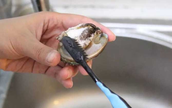 - 用匙羹把鮑魚撬出來,內臟全部拿走,用軟毛牙刷將鮑魚表面和側邊的黑色擦走。