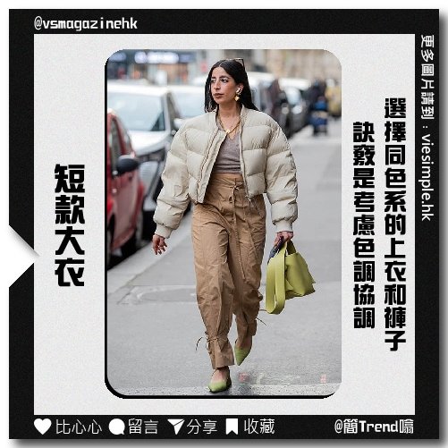 出生於巴黎的影響力人物Selma Kaci Sebbagh穿的是現在流行的造型:短款羽絨服。如果你身材嬌小,穿出這種風格的訣竅是考慮色調協調,選擇同色系的上衣和褲子,在這樣就不會把你的身體分成幾塊。
