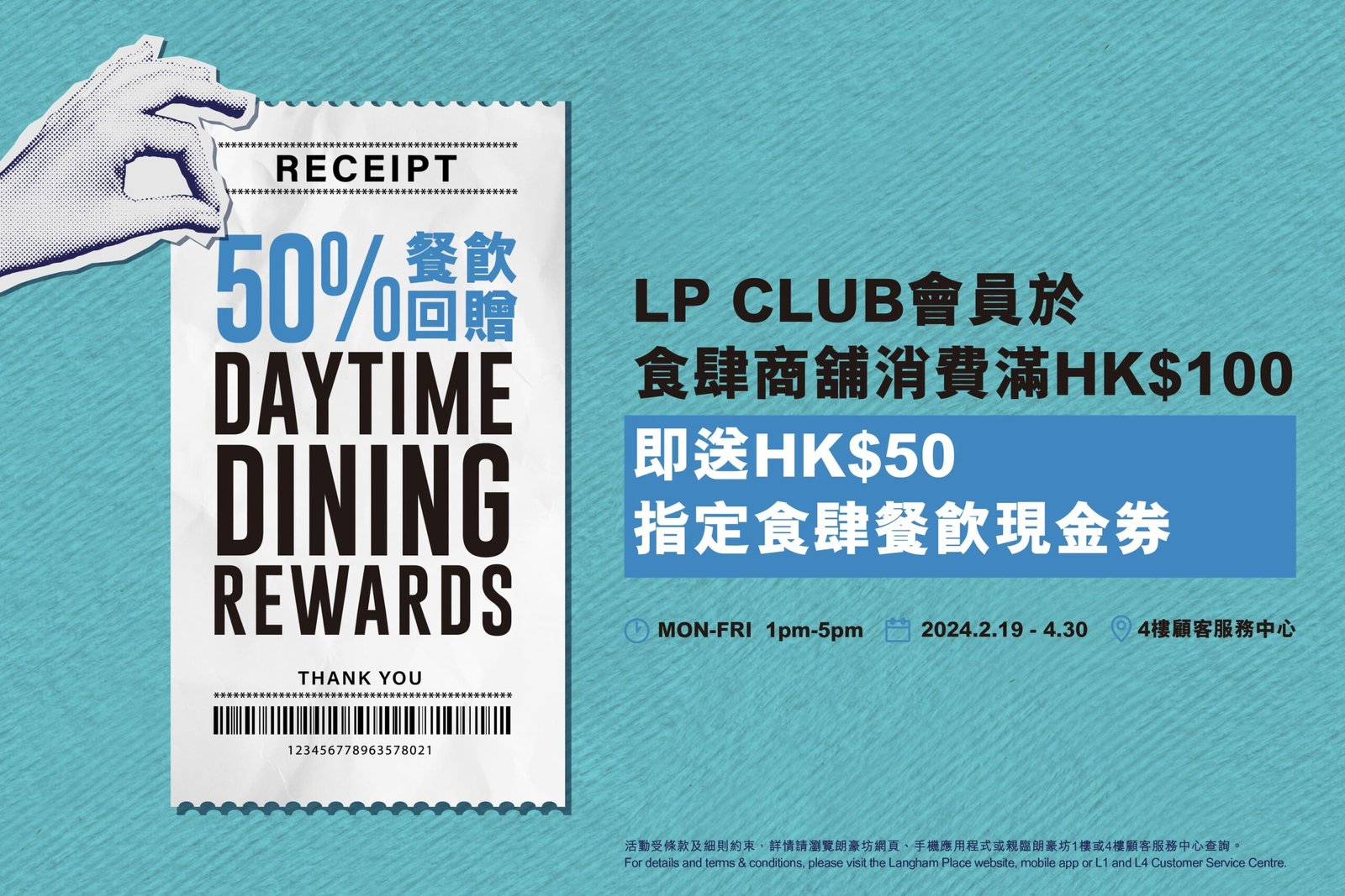 於推廣期內,逢星期一至五,下午1時至5時,LP CLUB會員只需於場內40間餐飲食肆其中一間消費滿HK$100,即可換領HK$50指定食肆餐飲電子現金券一張,於8樓至13樓的食肆商舖使用,現金券均不設任何消費門檻,更可疊加使用。而隨後每餐消費扣除回贈所得的食肆餐飲電子現金券又可以再賺。