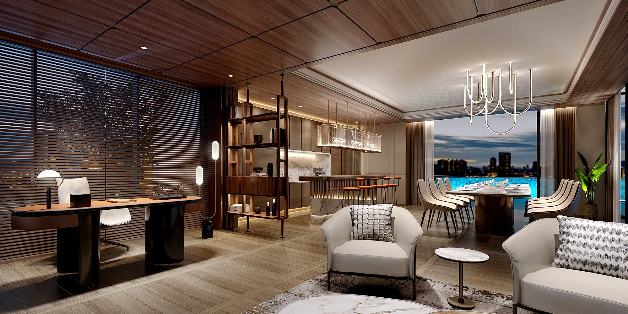 全新豪華旗艦酒店共有373間客房,設計受啟德碼頭迷人的海岸啟發。酒店提供相連客房,套房內附簡易烹飪設施,以滿足休閒旅客和長期住宿的商務旅客的需求,締造愜意的住宿體驗。最矚目的是兩間設計精美的總統套房,兩間套房均設有私人海景露台,並配有燒烤設施。總統泳池套房的私人露台特別設有一個10米長的室外小型泳池及日光浴床,讓客人遠離繁囂,沉浸在城市中的一片綠洲,放鬆身心。
