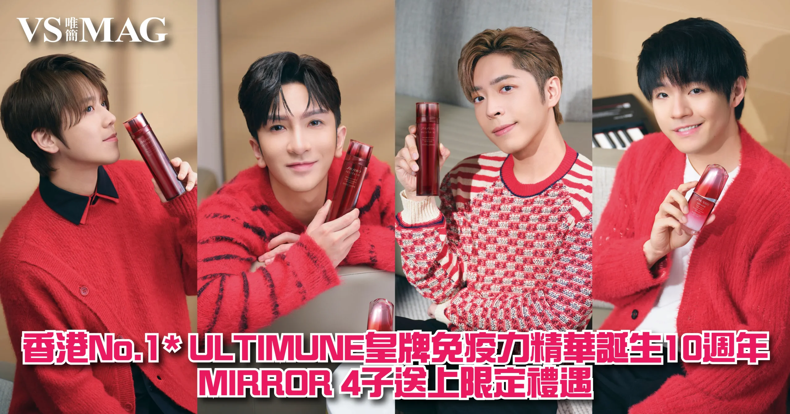 SHISEIDO資生堂為慶祝香港No.1*ULTIMUNE 皇牌免疫力精華誕生10週年,同步推出線上線下限定禮遇,包括SHISEIDO香港護膚代言人MIRROR 4子姜濤Keung To、盧瀚霆Anson Lo、呂爵安Edan及陳卓賢Ian的專屬禮品,與粉絲們共慶喜悅。