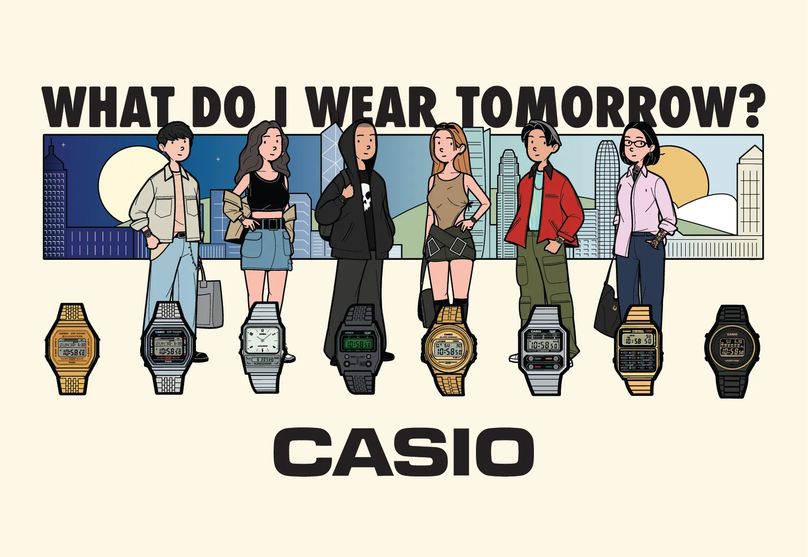 源自於日本的 City Boy 風潮可説是近年備受眾人追棒的穿搭造型之一,City Boy 具備一定的時尚敏感度,著重穿搭的層次,無論是在單品選擇或者整體配襯都能帶出日常隨意感,同時注重每件單品的細節,沒有既定的一貫風格,是結合各種形形色色的俐落與不受拘束的多變,並演繹出帶有強烈個人風格的街頭穿搭。CASIO 亦首次聯乘韓國時尚插畫藝術家 Aaron Chang 合作,帶來 「What Do I Wear Tomorrow?」 企劃,以插畫方式將時裝與 CASIO Vintage 手錶配搭出多樣的日常穿搭。