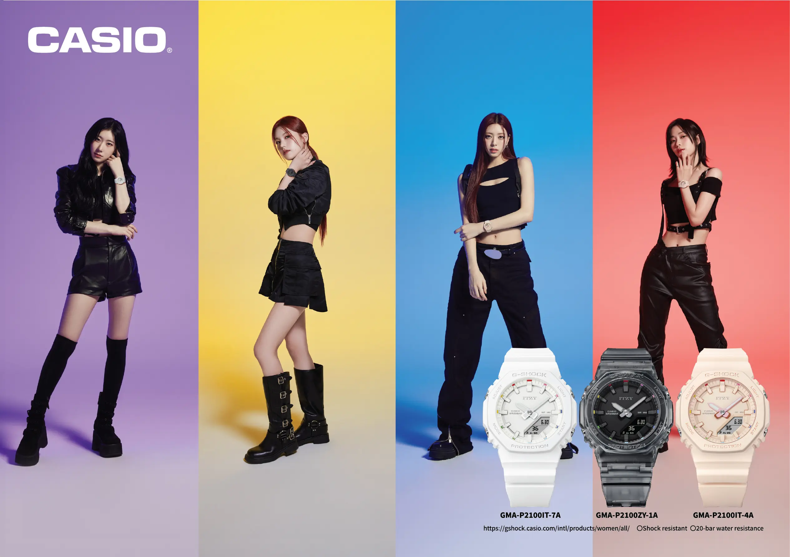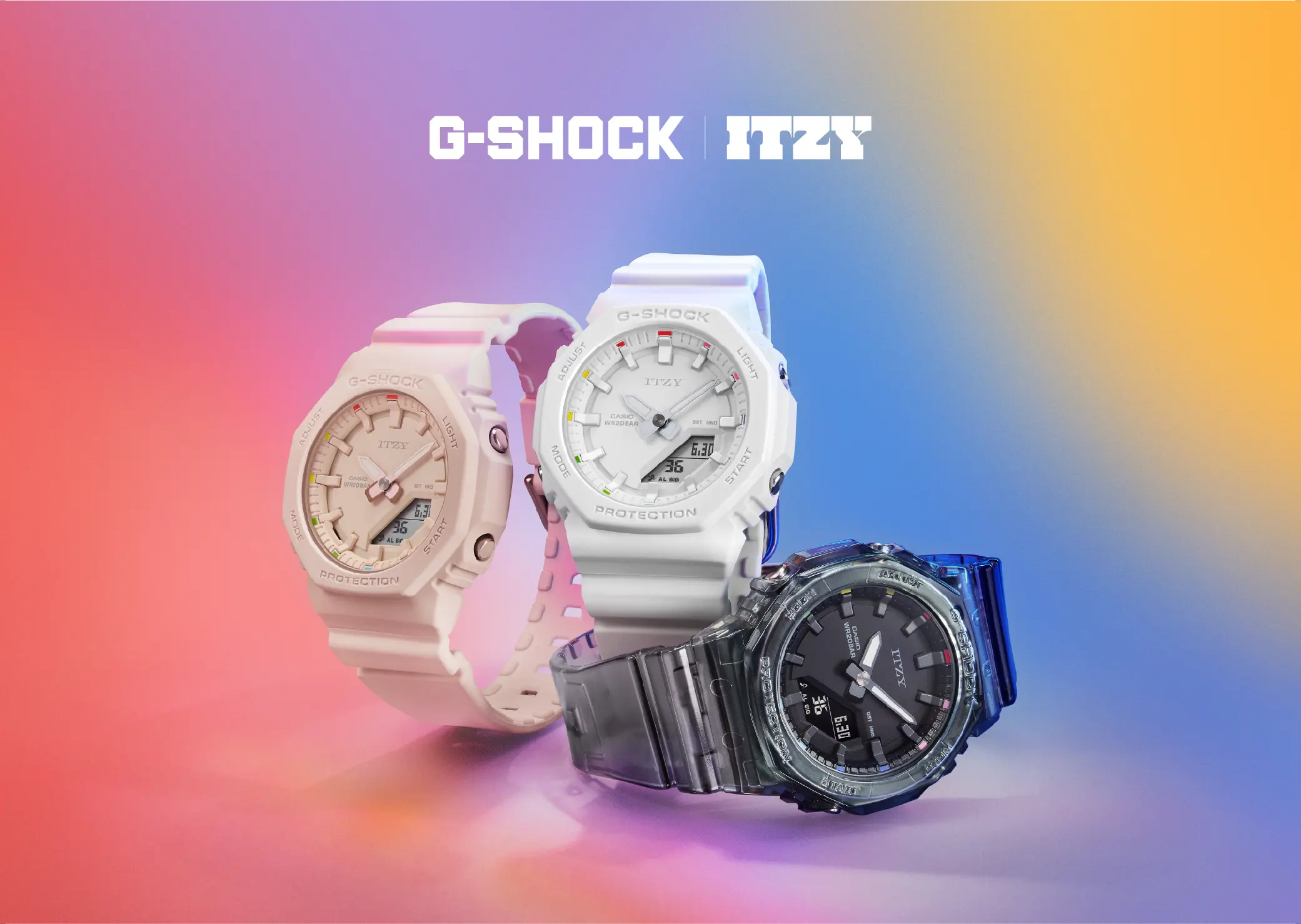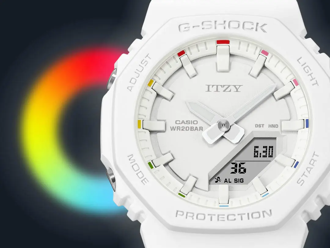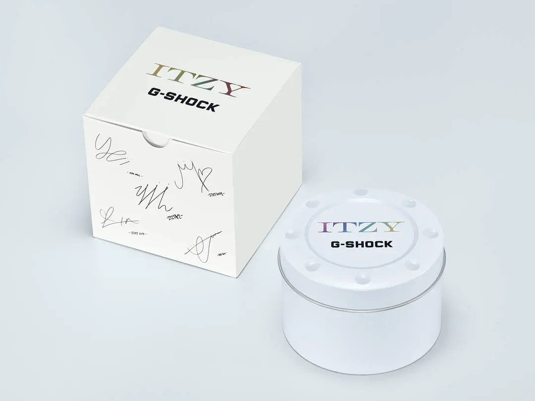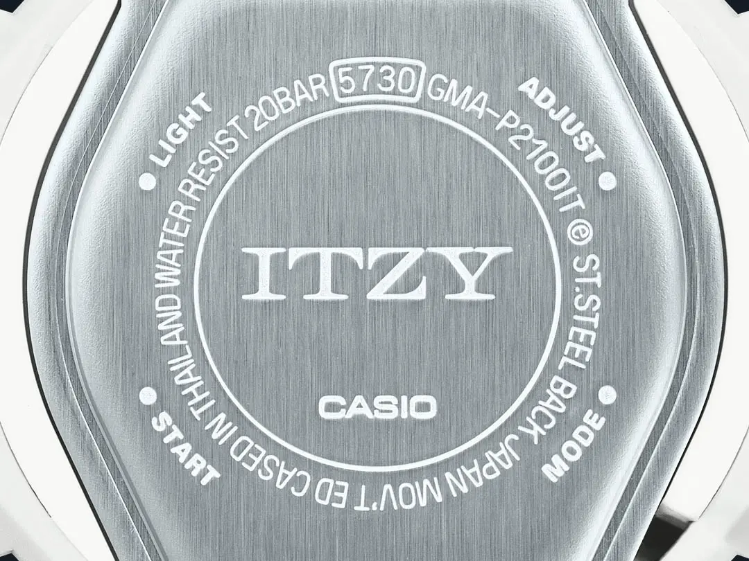 G-SHOCK x ITZY 聯乘手錶 — GMA-P2100IT 和 GMA-P2100ZY 均採用單色Tone on Tone設計,分別有型格的半透明黑色、溫柔的淡粉紅色和簡潔的白色等三個款式,使搭配變得輕而易舉。單色設計把焦點聚落在七彩時標上,多樣色彩靈感來自 ITZY 的官方應援手燈,象徵 ITZY 所呈現的無限可能。此外,為了紀念 G-SHOCK 和 ITZY 的首次合作,錶盤12點鐘位置及錶背刻有 ITZY 標誌。手錶還採用特別盒包裝,上面印有五位成員親筆簽名,絕對會是ITZY粉絲和時尚愛好者的收藏單品。