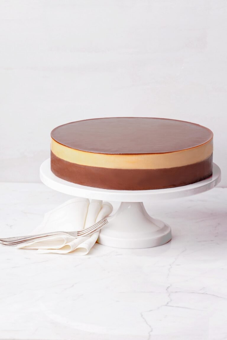 焦糖鏡面慕絲蛋糕頂層的焦糖光滑如鏡,在陽光的折射下更顯晶瑩剔透。中層為焦糖慕絲,焦糖香氣四溢,入口醇香絲滑;而朱古力慕絲則是甜中帶有一絲成熟苦澀的味道,夾著一層鬆軟濕潤的朱古力海綿蛋糕,多重滋味甜蜜誘人。蛋糕的甘甜餘韻在口中濔漫着,譜奏出奢華滋味。