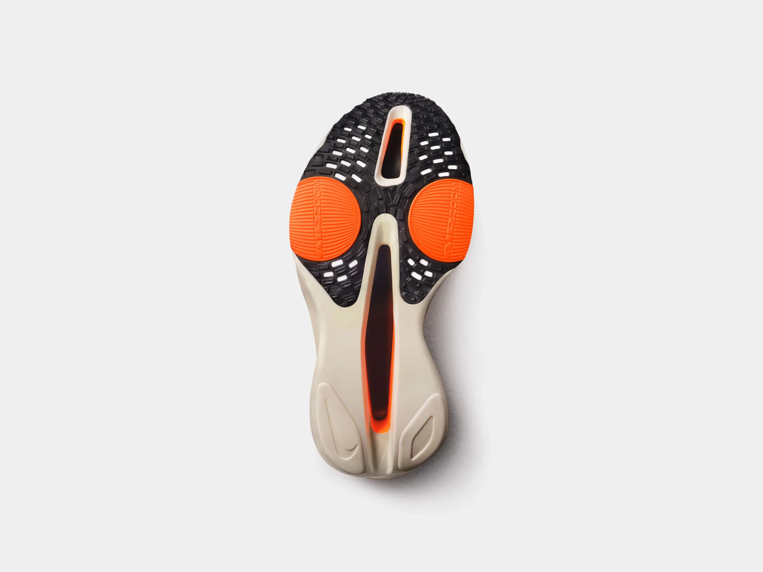 Nike Alphafly 3首次透過一體式鞋底連接後跟和前足,不論速度同樣為各種不同的著地方式提供同樣順暢穩定「從後跟到腳趾」的力量傳送。