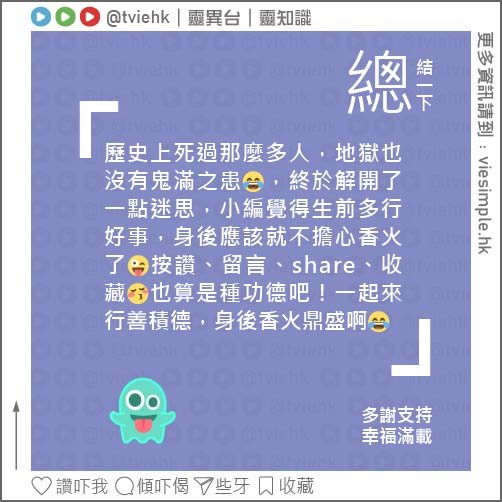 歷史上死過那麼多人,地獄也沒有鬼滿之患😂,終於解開了一點迷思,小編覺得生前多行好事,身後應該就不擔心香火了😜按讚、留言、share、收藏😚也算是種功德吧!一起來行善積德,身後香火鼎盛啊😂
